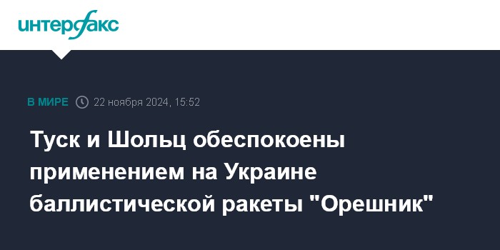 Москва. 22 ноября. INTERFAX.RU - Премьер-министр Польши Дональд Туск расценил применение Россией баллистической ракеты "Орешник" на Украине как признак эскалации конфликта, сообщают европейские СМИ.