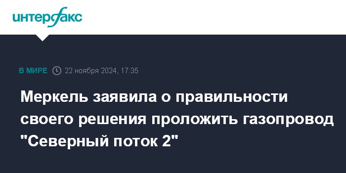 Москва. 22 ноября. INTERFAX.RU - Экс-канцлер Германии Ангела Меркель выступила в защиту своего решения разрешить строительство газопровода "Северный поток 2", объяснив его необходимостью поставок дешевого газа.