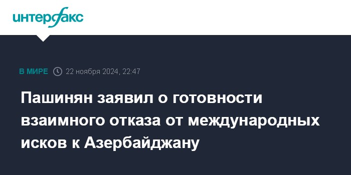 Москва. 22 ноября. INTERFAX.RU - Армения по принципу взаимности готова отказаться от международных исков против Азербайджана, заявил армянский премьер-министр Никол Пашинян в интервью общественному телевидению страны.