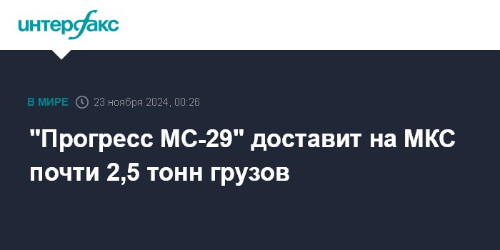 Москва. 23 ноября. INTERFAX.RU - Транспортный грузовой корабль "Прогресс МС-29", стартовавший в четверг с космодрома Байконур, как ожидается, в субботу пристыкуется к Международной космической станции (МКС).