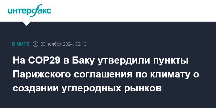 Москва. 23 ноября. INTERFAX.RU - Азербайджанское председательство COP29 объявило о достижении договоренности по созданию углеродных рынков в рамках пунктов 6.2 и 6.4 статьи 6 Парижского соглашения по климату.