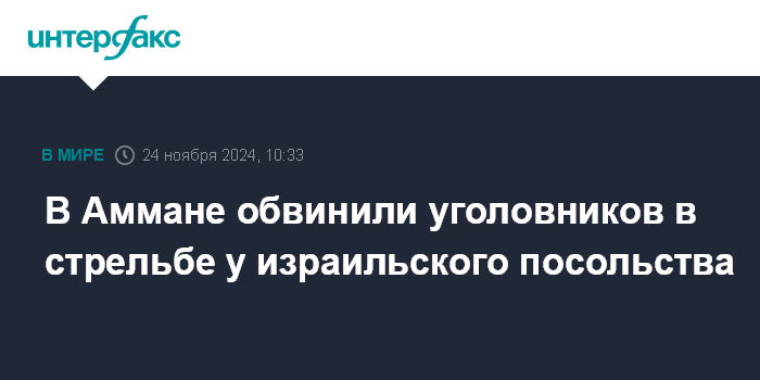 Москва. 24 ноября. INTERFAX.RU - Власти Иордании возложили на уголовников ответственность за стрельбу у посольства Израиля в воскресенье, сообщает EFE.