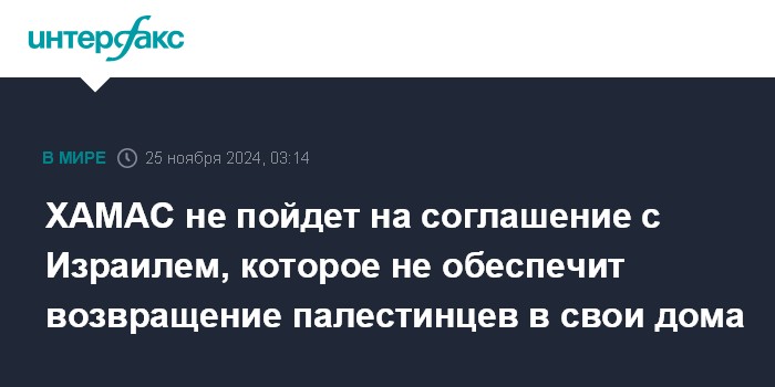 Москва. 25 ноября. INTERFAX.RU - Приоритетом ХАМАС является прекращение агрессии Израиля, но движение согласится только на те соглашения с Израилем, которые дадут возможность палестинцам вернуться в свои дома и обеспечат условия для их нормальной жизни, заявил представитель движения Сами Абу Зухри.