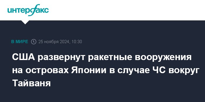 Москва. 25 ноября. INTERFAX.RU - США разместят ракетные подразделения на юго-западных островах Японии и на Филиппинах в случае кризисной ситуации вокруг Тайваня, сообщает Kyodo News со ссылкой на источники, информированные о развитии отношений Японии и США.