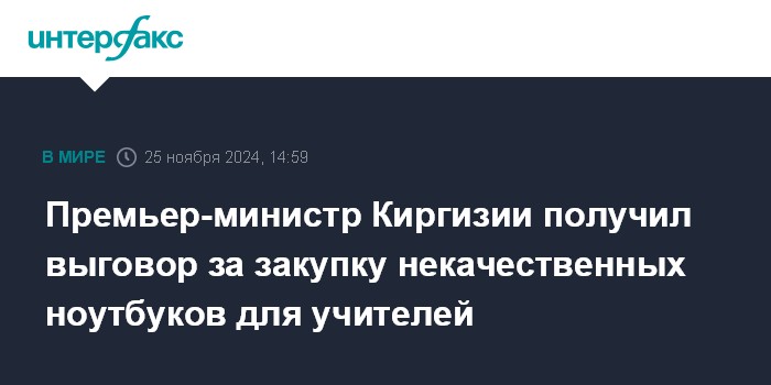 Москва. 25 ноября. INTERFAX.RU - Президент Киргизии Садыр Жапаров объявил выговор премьер-министру Акылбеку Жапарову и еще нескольким чиновникам за покупку некачественных ноутбуков для учителей, сообщила пресс-служба киргизского лидера.