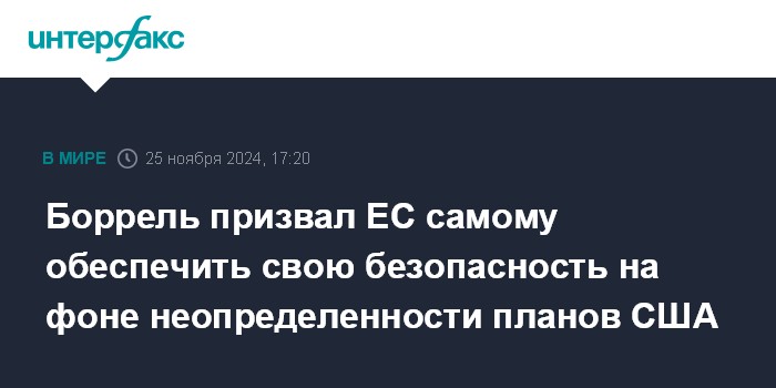 Москва. 25 ноября. INTERFAX.RU - Высокий представитель Евросоюза по иностранным делам Жозеп Боррель призвал укреплять безопасность ЕС таким образом, чтобы она меньше зависела от США. Он написал об этом в статье, в которой подводит итоги своей деятельности на посту главы дипломатии ЕС.