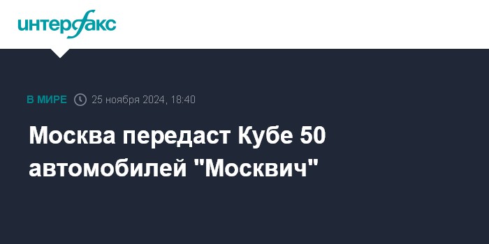 "Москва поможет Кубе создать таксопарк из автомобилей "Москвич". Соответствующий меморандум о намерениях подписали (заммэра Москвы по вопросам транспорта) Максим Ликсутов и министр транспорта Республики Куба Эдуардо Родригес Давила (...) Столица готова предоставить кубинским коллегам партию из 50 "Москвичей" и оценить возможность адаптации их систем мультимедиа на испанский язык", - говорится в сообщении, размещенном в телеграм-канале столичного департамента транспорта в понедельник.