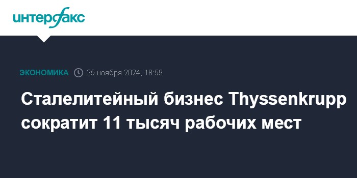 Москва. 25 ноября. INTERFAX.RU - Сталелитейное подразделение германской промышленной группы Thyssenkrupp сократит производственные мощности в ответ на сложные рыночные условия, а также уменьшит штат сотрудников на 11 тысяч человек.