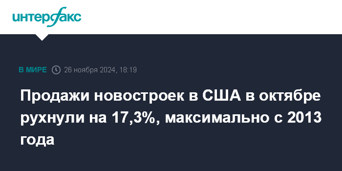 Москва. 26 ноября. INTERFAX.RU - Продажи новых домов в США в октябре упали на 17,3% по сравнению с предыдущим месяцем и составили минимальные почти за два года (с ноября 2022 года) 610 тыс. в пересчете на годовые темпы, сообщило министерство торговли страны.