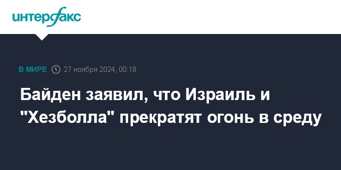 Москва. 27 ноября. INTERFAX.RU - Израильские военные и ливанское движение "Хезболла" прекратят боевые действия в среду рано утром, заявил президент США Джо Байден.