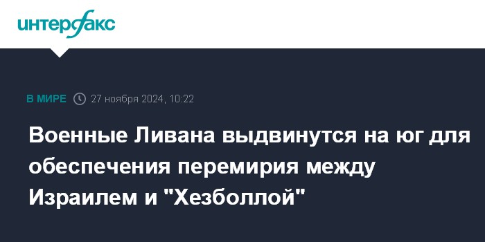 Москва. 27 ноября. INTERFAX.RU - Командование ВС Ливана ведет подготовку к переброске военных на юг Ливана по условиям соглашения о прекращении огня между Израилем и движением "Хезболла", сообщает в среду телеканал LBCI.