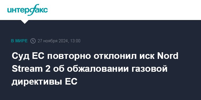 Москва. 27 ноября. INTERFAX.RU - Суд ЕС (General Court of the European Union) повторно отклонил иск Nord Stream 2 об обжаловании газовой директивы Евросоюза, говорится в сообщении суда.