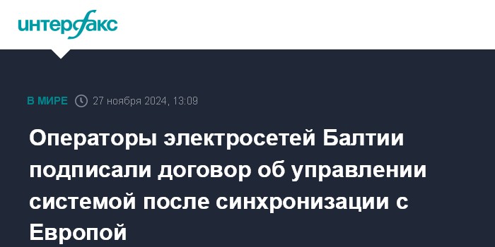 Москва. 27 ноября. INTERFAX.RU - Операторы электропередающих сетей Литвы, Латвии и Эстонии – Litgrid, Augstsprieguma tikls (АСТ) и Elering – заключили в среду соглашение об управлении системой Балтийского региона после синхронизации с сетями континентальной Европы, намеченной на февраль следующего года.