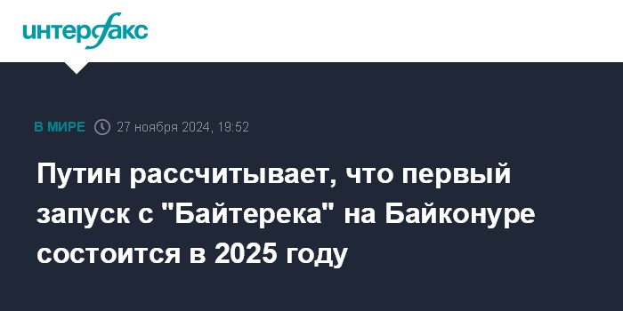Москва. 27 ноября. INTERFAX.RU - Первый запуск с космического ракетного комплекса "Байтерек" на Байконуре, как и запланировано, состоится в 2025 году, заявил на пресс-конференции президент России Владимир Путин после переговоров с казахстанским лидером Касым-Жомартом Токаевым.