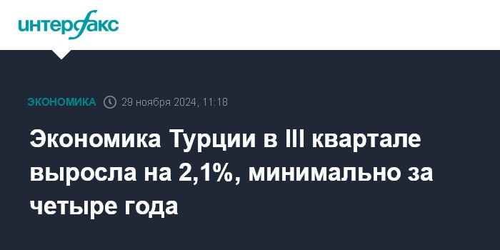 Москва. 29 ноября. INTERFAX.RU - Темпы роста турецкого ВВП в третьем квартале 2024 года замедлились до 2,1% в годовом выражении после подъема на 2,4% кварталом ранее, сообщил статистический институт страны (TurkStat).