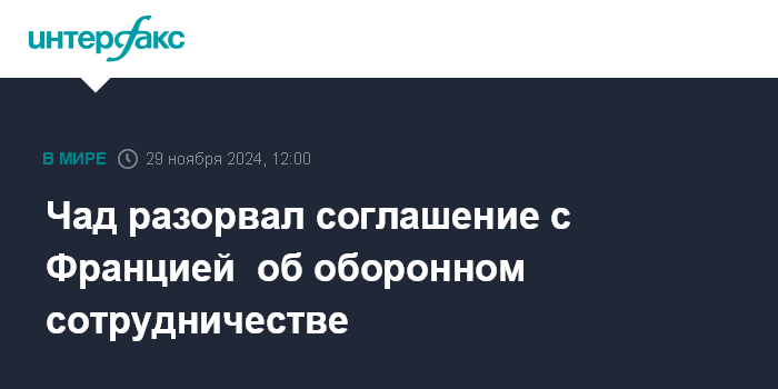 Москва. 29 ноября. INTERFAX.RU - МИД Чада объявил о разрыве соглашения об оборонном сотрудничестве с Францией, сообщает AP.