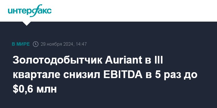 Москва. 29 ноября. INTERFAX.RU - Шведская Auriant Mining, добывающая золото в РФ, по итогам 9 месяцев 2024 года снизила EBITDA на 22% до $3,7 млн, сообщила компания.