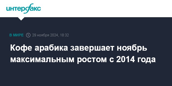 Москва. 29 ноября. INTERFAX.RU - Фьючерсы на кофе арабика завершают ноябрь максимальным ростом за десять лет.