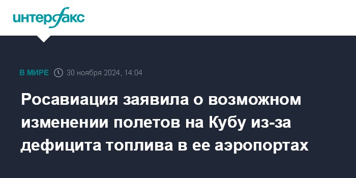 "Возможные изменения связаны с двумя NOTAM (извещениями), которые выпустили авиационные власти Кубы. В извещениях сказано о дефиците авиакеросина для всех без исключения перевозчиков в аэропортах Гаваны и Варадеро в течении недели: с 08:01 мск 1 декабря по 08:00 мск 8 декабря", - сказали в ведомстве.