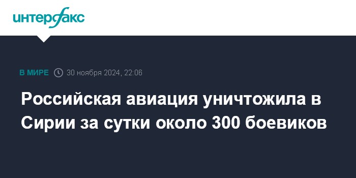 Москва. 30 ноября. INTERFAX.RU - Около 300 боевиков ликвидированы за сутки в Сирии в результате ударов ВКС России в рамках помощи сирийской правительственной армии, заявили российские военные.