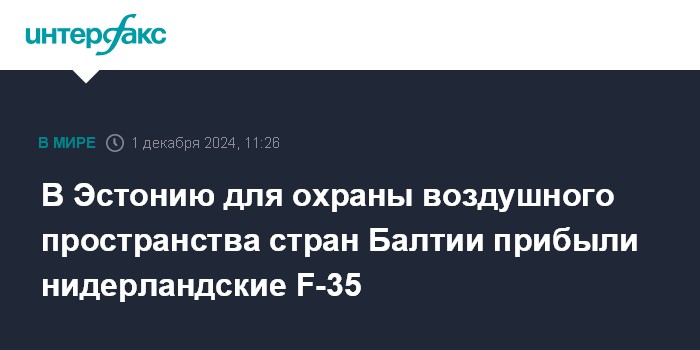 Москва. 1 декабря. INTERFAX.RU - В Эстонию для охраны воздушного пространства стран Балтии прибыли истребители 322-й эскадрильи королевских ВВС Нидерландов, сообщила в воскресенье пресс-служба министерства обороны.
