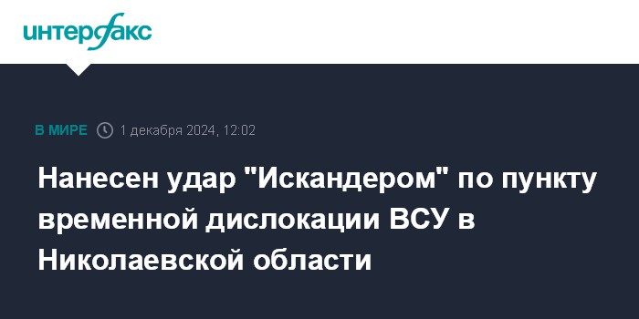 Москва. 1 декабря. INTERFAX.RU - Российские военные нанесли удар оперативно-тактическим комплексом "Искандер" по пункту временной дисклокации вооруженных сил Украины в Николаевской области, сообщили в Минобороны РФ в воскресенье.