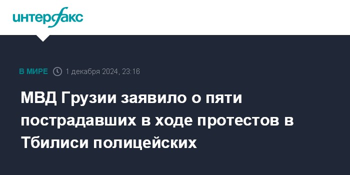 Москва. 1 декабря. INTERFAX.RU - Пять полицейских пострадали за последние часы от рук участников акции протеста в Тбилиси против приостановки евроинтеграции Грузии, заявил в воскресенье вечером замглавы грузинского МВД Александр Дарахвелидзе на брифинге.