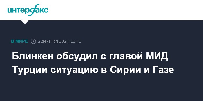 Москва. 2 декабря. INTERFAX.RU - Госсекретарь США Энтони Блинкен обсудил с министром иностранных дел Турции Хаканом Фиданом ситуацию в Сирии и секторе Газа, сообщает госдепартамент Соединенных Штатов.