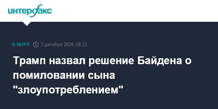 Москва. 2 декабря. INTERFAX.RU - Избранный президент США Дональд Трамп назвал решение президента Джо Байдена помиловать собственного сына Хантера "злоупотреблением" и нарушением норм правосудия.