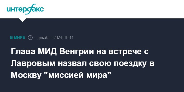 Москва. 2 декабря. INTERFAX.RU - Глава МИД Венгрии Петер Сийярто в ходе встречи с российским министром иностранных дел Сергеем Лавровым в понедельник заявил, что прибыл в Москву с "миссией мира".