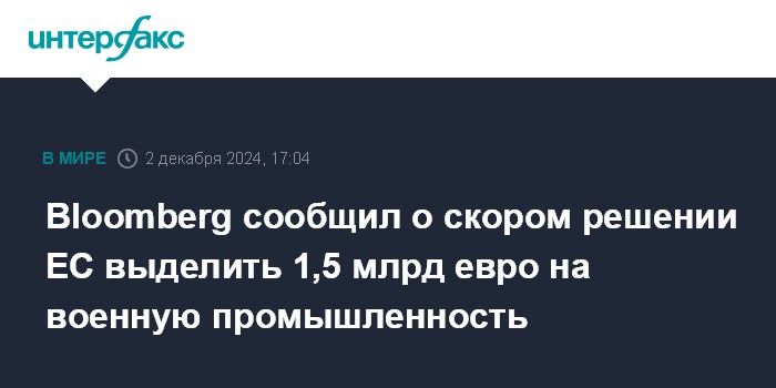 Bloomberg сообщил о скором решении ЕС выделить 1,5 млрд евро на военную промышленность
