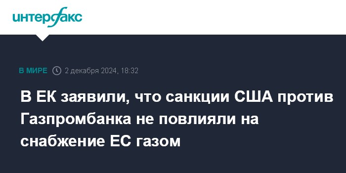 В ЕК заявили, что санкции США против Газпромбанка не повлияли на снабжение ЕС газом