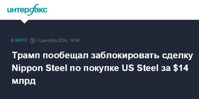 Москва. 3 декабря. INTERFAX.RU - Избранный президент США Дональд Трамп пообещал заблокировать сделку по покупке американской сталелитейной компании United States Steel Corp. (US Steel) японской Nippon Steel.