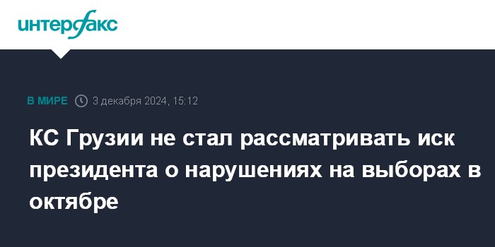 Москва. 3 декабря. INTERFAX.RU - Конституционный суд (КС) Грузии не принял к рассмотрению иски президента Саломе Зурабишвили и 30 оппозиционных политиков о нарушении Конституции при проведении парламентских выборов 26 октября, говорится в сообщении КС.