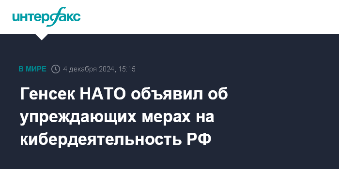 Москва. 4 декабря. INTERFAX.RU - Главы МИД стран НАТО согласовали упреждающие меры по противодействию кибердеятельности и другим угрозам со стороны РФ, заявил генсек альянса Марк Рютте.