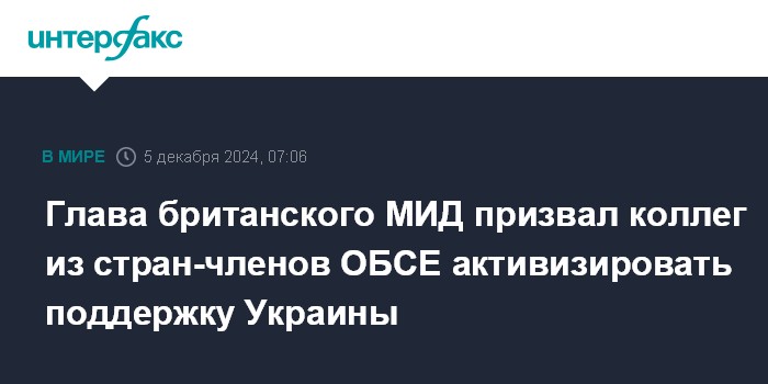 Москва. 5 декабря. INTERFAX.RU - Страны ОБСЕ для обеспечения безопасности Европы должны активизировать поддержку Украины, заявил министр иностранных дел Великобритании Дэвид Лэмми.