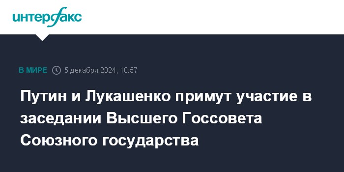 Москва. 5 декабря. INTERFAX.RU - В Минске 6 декабря состоится заседание Высшего Государственного Совета Союзного государства, в котором примут участие президенты России и Белоруссии Владимир Путин и Александр Лукашенко, сообщила пресс-служба Кремля.