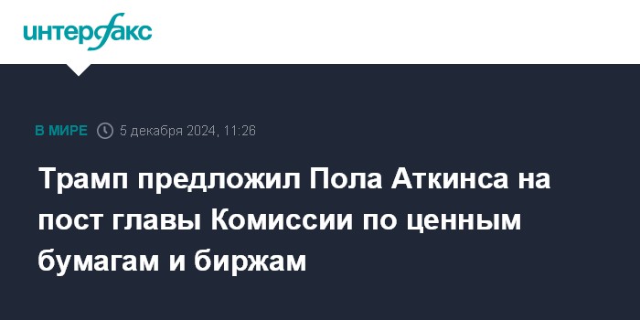 Трамп предложил Пола Аткинса на пост главы Комиссии по ценным бумагам и биржам
