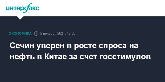 "В течение ближайшей недели там состоится стратегическое совещание руководства КНР, которое определит объемы стимулирования экономики. По информации, которая нам доступна, речь идет о выделении более 50 трлн юаней для субъектов рынка, и если это произойдет, то безусловно потребление в Китае будет расти, и это создаст дополнительные возможности для поставки в Китай", - сказал Сечин.