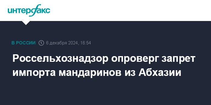 Ранее и.о. премьера Абхазии Валерий Бганба заявил "Интерфаксу", что Россия запретила поставки мандаринов из Абхазии, "ссылаясь на решение санитарных служб".