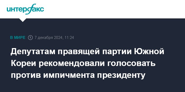 Москва. 7 декабря. INTERFAX.RU - Правящая в Южной Корее партия "Сила народа" приняла решение голосовать против импичмента президенту страны Юн Сок Ёлю, сообщает в субботу Yonhap.