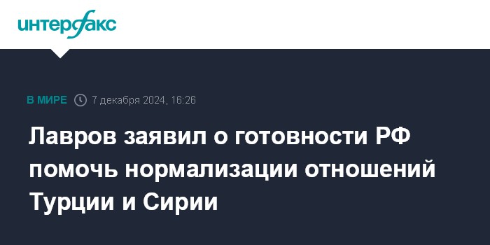 Москва. 7 декабря. INTERFAX.RU - Отношения Турции и Сирии необходимо нормализовать, Россия в астанинском формате обсуждает ряд идей по тому, как обеспечить безопасность турецко-сирийской границы при сохранении территориальной целостности Сирии, заявил глава МИД РФ Сергей Лавров.