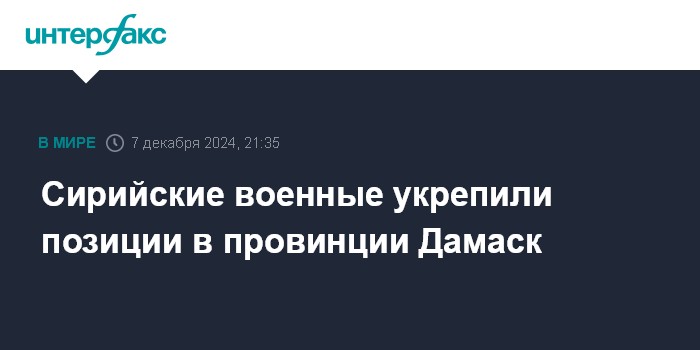 Москва. 7 декабря. INTERFAX.RU - Сирийская арабская армия в субботу сообщила об укреплении позиций в провинции Дамаск, сообщает агентство EFE со ссылкой на представителя армии.