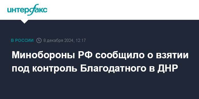 Москва. 8 декабря. INTERFAX.RU - Населенный пункт Благодатное в ДНР перешел под контроль Вооружённых сил России, сообщает министерство обороны РФ.