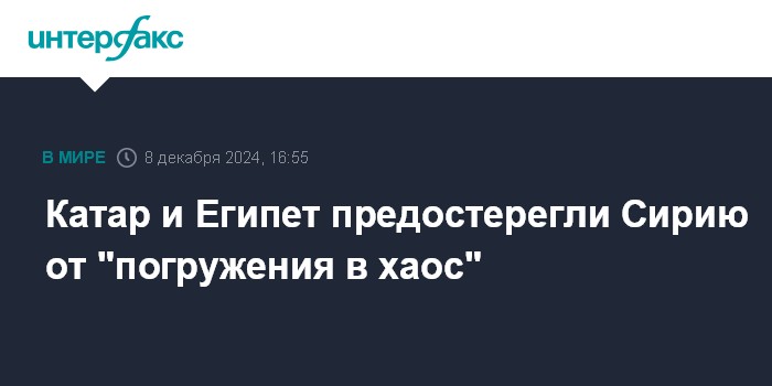 Москва. 8 декабря. INTERFAX.RU - Власти Катара и Египта следят за развитием ситуации в Сирии и призывают страну сохранить свою территориальную целостность и избежать погружения в хаос.