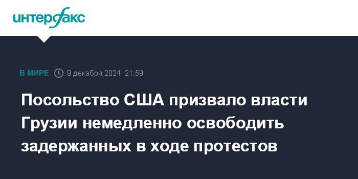Москва. 9 декабря. INTERFAX.RU - Посольство США в Грузии считает, что задержанные грузинской полицией участники акций протеста должны быть немедленно освобождены.