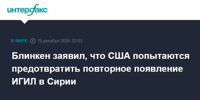 Москва. 10 декабря. INTERFAX.RU - Госсекретарь США Энтони Блинкен заявил, что Соединенные Штаты намерены не допустить повторного появления ИГИЛ (запрещенная в РФ террористическая организация) в Сирии.