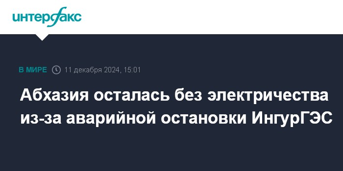 Москва. 11 декабря. INTERFAX.RU - Произошла аварийная остановка ИнгурГЭС, питающая Абхазию электроэнергией, вся Абхазия оказалась без электричества, сообщает "Черноморэнерго".