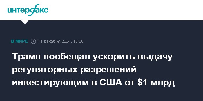 Москва. 11 декабря. INTERFAX.RU - Избранный президент США Дональд Трамп пообещал ускорить выдачу разрешений регулирующих органов инвесторам, вкладывающим в экономику страны $1 млрд и более.