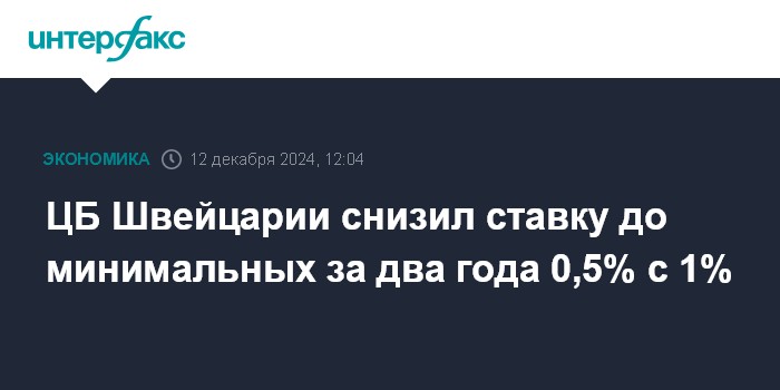 ЦБ уменьшил ставку по итогам четвертого заседания подряд, до минимума с ноября 2022 года, на фоне ослабления темпов роста потребительских цен в стране. Инфляция в Швейцарии в ноябре упала до 0,7% с 1,1% в августе.